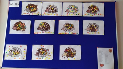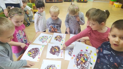 16 października 2020r dzieci z grupy 4Ci wykonały prace plastyczną „Jesienne Jeże". Praca wykonana z użyciem plastikowych widelców, które posłużyły do odciskania farby na konturze jeża. Kolejnym etapem wykonania pracy było naklejanie jesiennych, kolorowych listków. Celem pracy było: rozwijanie sprawności manualnej dzieci i kreatywności.
