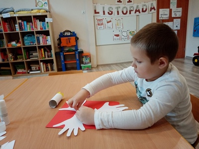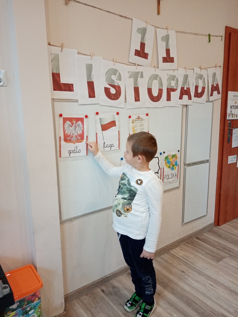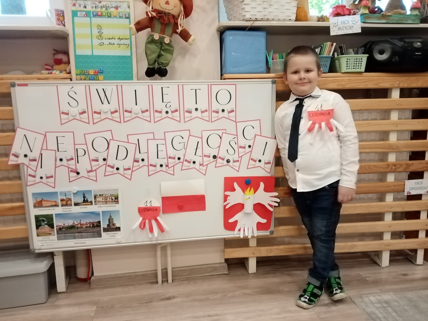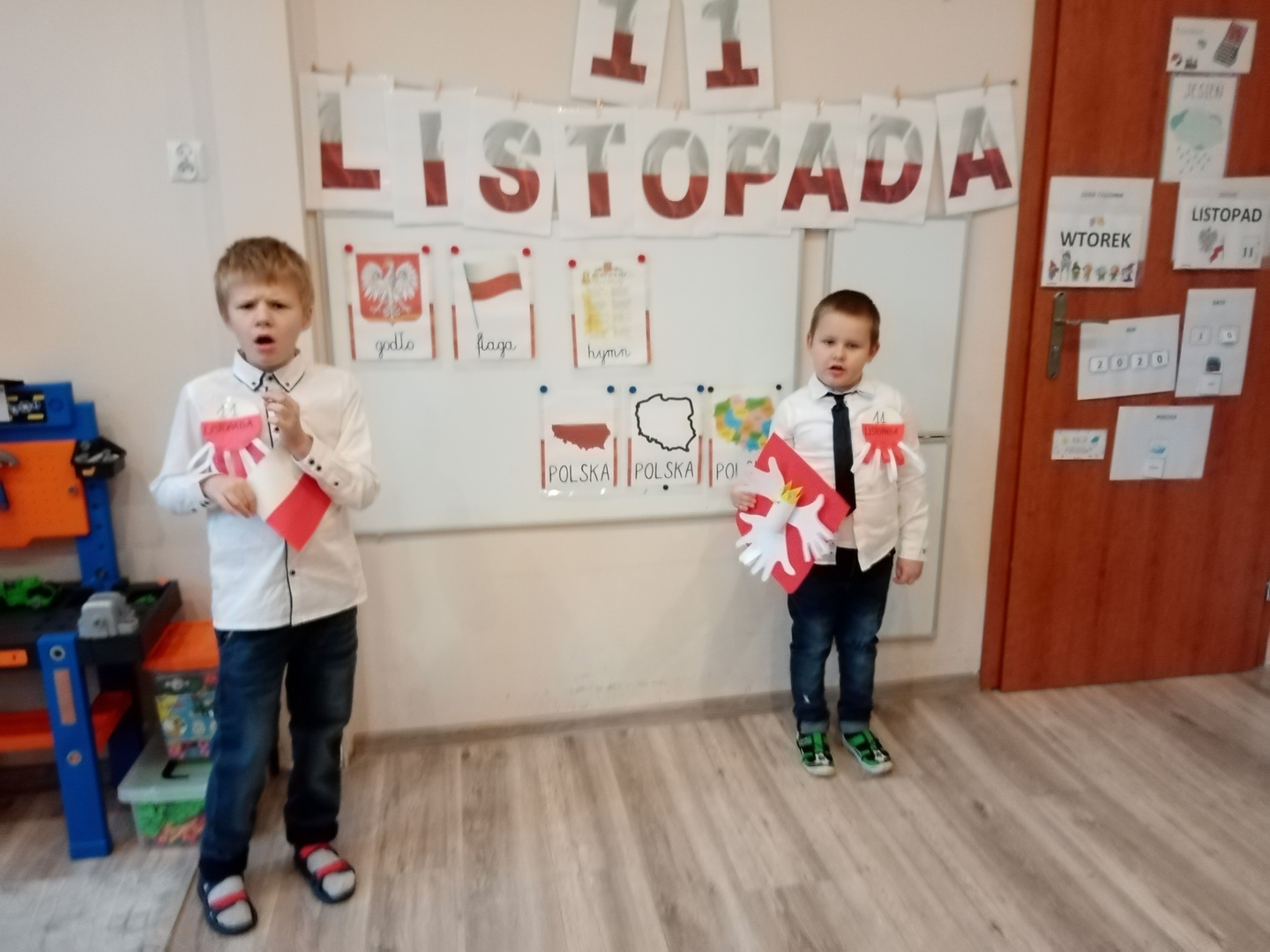 Dzieci z grupy S3 uczciły to święto wykonując różnorodne aktywności. Przedszkolaki wykonały prace plastyczne przedstawiające symbole narodowe – godło, flagę, biało – czerwone kotyliony, „Nasza ojczyzna, nasz dom Polska”. Dzieci poznały największe polskie miasta i stolicę kraju. Wspólnie odsłuchaliśmy hymn narodowy, jak również utwory o tematyce patriotycznej, piosenki dla dzieci: „Jest takie miejsce Polska” i „Co to jest niepodległość”. Olek wyrecytował wiersz Władysława Bełzy „Katechizm polskiego dziecka”.
