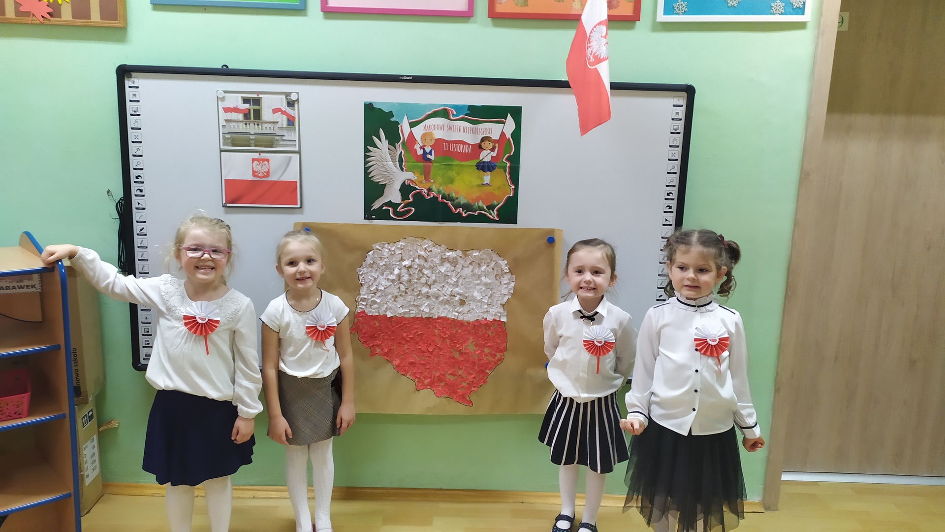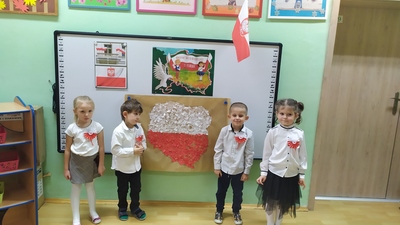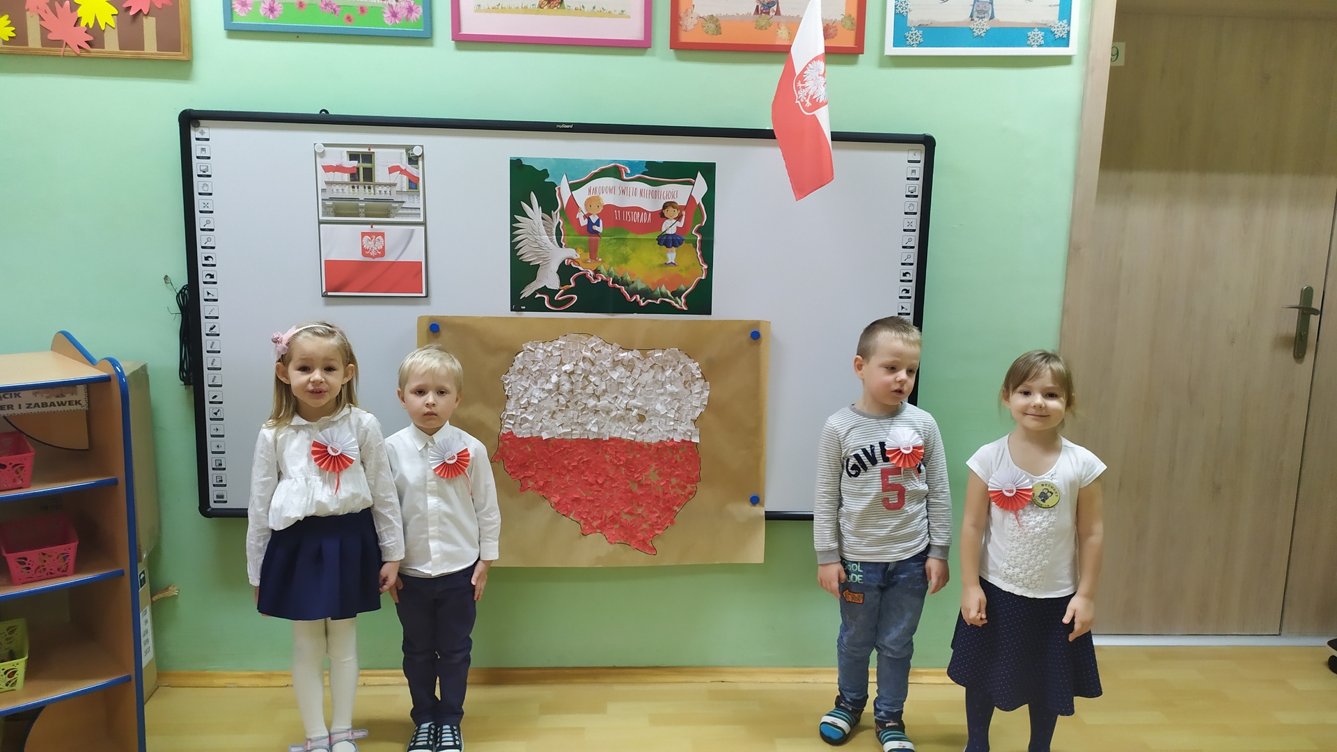 Wydarzeniem, które ma znaczące miejsce w pracy dydaktyczno-wychowawczej naszego Przedszkola, są obchody Narodowego Święta Niepodległości. Dlatego przez cały tydzień podejmowaliśmy wiele działań, które skupione były wokół wychowania patriotycznego, przywiązania do swojej Ojczyzny. Dzieci utrwalały informacje o naszym kraju oraz symbole narodowe. Poznawały również legendy polskie, pieśni patriotyczne, tworzyły prace plastyczne. 12 listopada, przystrojeni w kotyliony z wielkim oddaniem odśpiewały Hymn Polski.