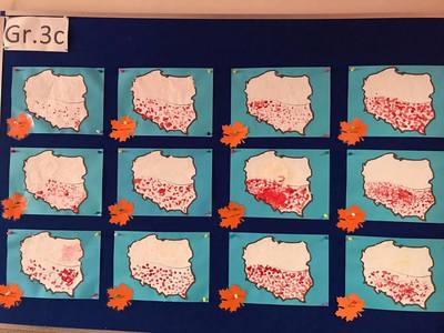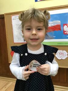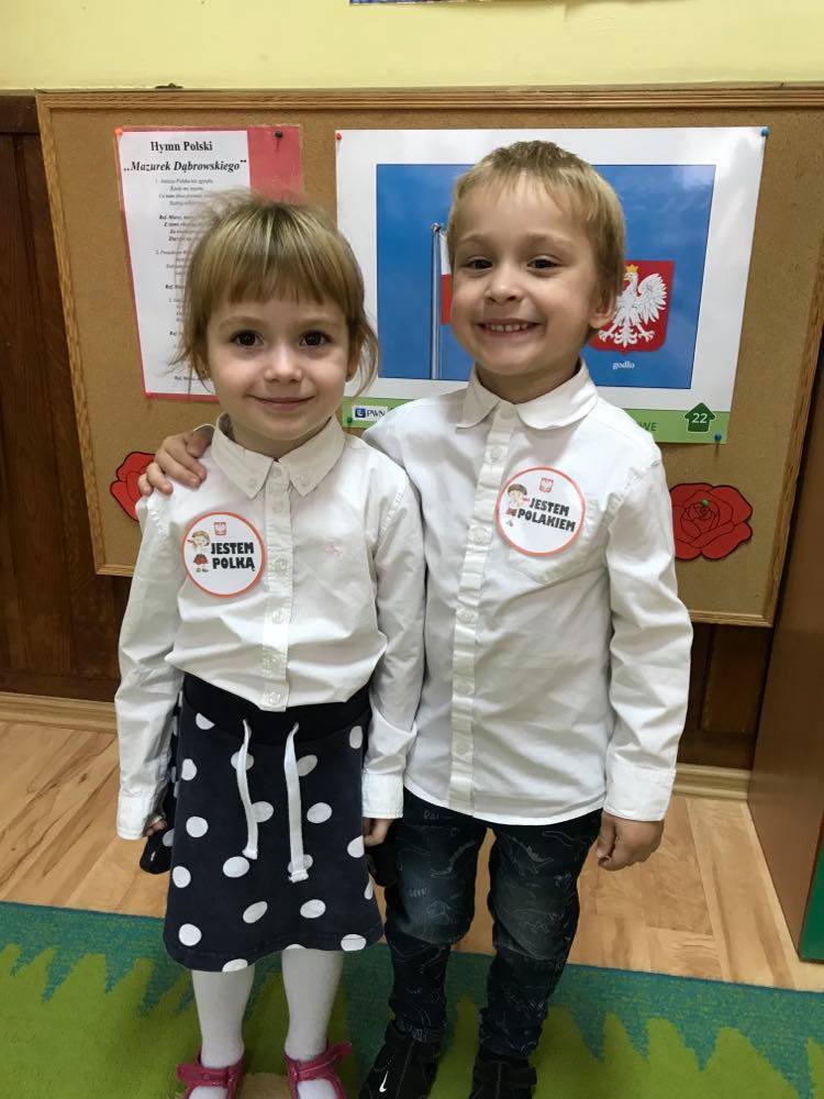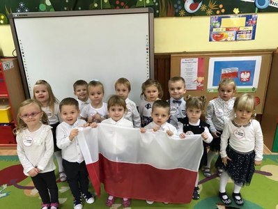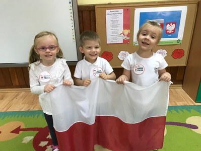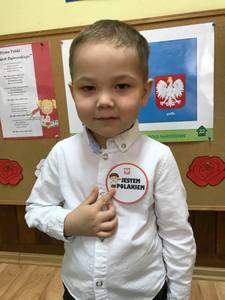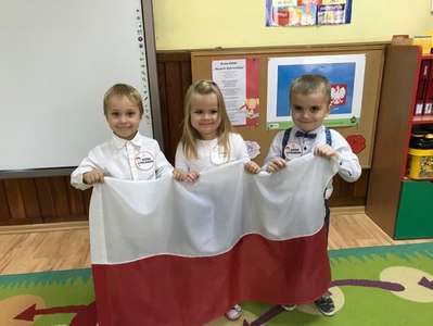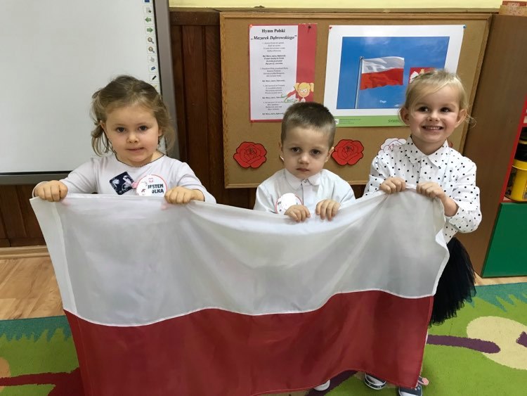 Dzień 11 listopada to jedna z najważniejszych dat w historii naszego kraju. Dlatego też 10 listopada przedszkolaki z grupy 3C wyglądały odświętnie i uroczyście, a na ich piersi widniały medale w barwach narodowych z napisem: Jestem Polakiem. Nasi „Mali Polacy” tego dnia zdobyli wiedzę o tym, kto to jest patriota i utrwalili wiadomości na temat symboli narodowych. Dumnie, przyjmując właściwą postawę „na baczność”, odśpiewały też hymn Polski „Mazurek Dąbrowskiego”, a w piątek ozdobili kontur Polski barwami narodowymi. Dzięki udziałowi w tego typu zajęciach przedszkolaki od najmłodszych lat uczą się patriotyzmu, kształtują pozytywne postawy i uczucia patriotyczne.