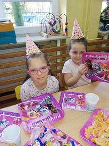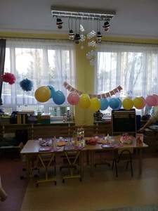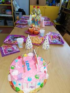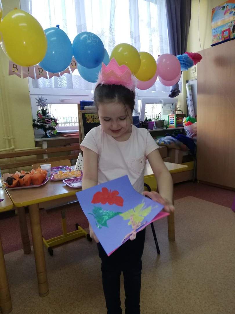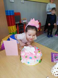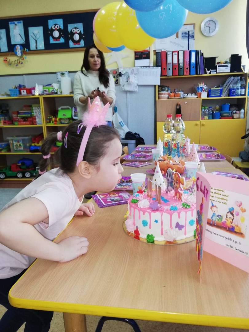 Przyjęcie urodzinowe zawsze budzi wielkie emocje u dzieci i tak dziś był u nas w przedszkolu. Jedna z dziewczynek gr. S1 Lenusia obchodziła dziś 6 urodzinki. Nie mogło zabraknąć pięknego, pysznego tortu, wspaniałych smakołyków i oczywiście pełnej kolorów dekoracji. Paleta kolorów i smaków wywołała u przedszkolaków piękny uśmiech i radość. Lenusia, niech Ci słonko ciepło gra, niech Twój uśmiech długo trwa. Nie trać swej wesołej minki, dziś są Twoje urodzinki!!!
