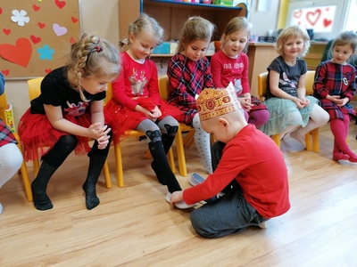 W dniu 15.02. w grupie 4B obchodziliśmy Walentynki. Przygotowania do tego dnia rozpoczęliśmy od akcji "Od przedszkolaka dla świetliczaka- od świetliczaka dla przedszkolaka", która polegała na wymianie kartek walentynkowych z dziećmi uczęszczającymi na świetlicę w PSP nr 34 w Radomiu. Nasze Przedszkolaki już kilka dni przed Walentynkami przygotowały piękne kartki, które zostały przekazane "świetliczakom". W naszej grupie obchodom Walentynek towarzyszyły gry i zabawy, rozmawialiśmy także o miłości i przyjaźni względem naszych bliskich oraz śpiewaliśmy piosenkę pt. "Małe serduszko". Dzień upłynął nam w niezwykle radosnej atmosferze, a jego uwieńczeniem było otrzymanie kartek walentynkowych przygotowanych wcześniej przez starszych kolegów oraz pamiątkowe zdjęcia w serduszkowej foto-ramce.