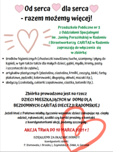 Od serca dla serca- razem możemy więcej!!!! Serdecznie zachęcamy do włączenia się w akcje!!!! Zbiórka dla dzieci mieszkających w domu dla bezdomnych Caritas Diecezji Radomskiej
