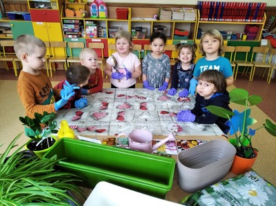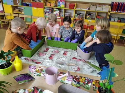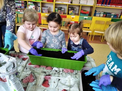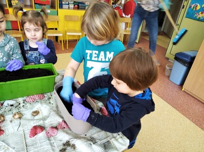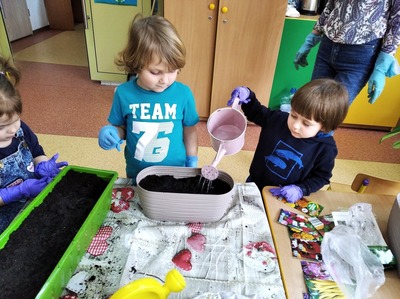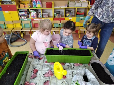 Dzieci z grupy 3a postanowiły pobawić się w ogrodnika i ogrodniczki. Wraz z nauczycielką, przedszkolakom udało się zasadzić cebulki kwiatów i nasiona roślinek, które przynieśli do przedszkola. Dzieci z zapałem zabrały się do pracy: uklepywały ziemię, wkładały cebuli do ziemi i podlewały. Już nie możemy się doczekać co wyrośnie z naszych sadzonek. Wszystkim rodzicom serdecznie dziękujemy za dostarczenie materiałów (sadzonki, nasiona, ziemia, doniczki) do naszych ogrodniczych zajęć. To jednak nie koniec naszego sadzenia. Niebawem wrócimy z kolejną porcją zdjęć.