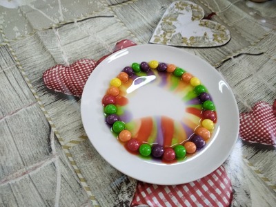 Przedstawiamy realizację projektu edukacyjnego „Mali badacze”. Maluszki z grupy 3a przeprowadziły dwa eksperymenty. Dowiedziały się , że tęcza nie musi być tylko na niebie. Utworzyły tęczę z cukierków na talerzu. Kolejny eksperyment udowodnił dzieciom, że mydło zwalcza wszelki brud. Nasypany na talerzyk pieprz w wodzie, uciekał przed namydlonymi rączkami hen, hen. Maluszki wiedzą najlepiej, jak dbać o higienę.