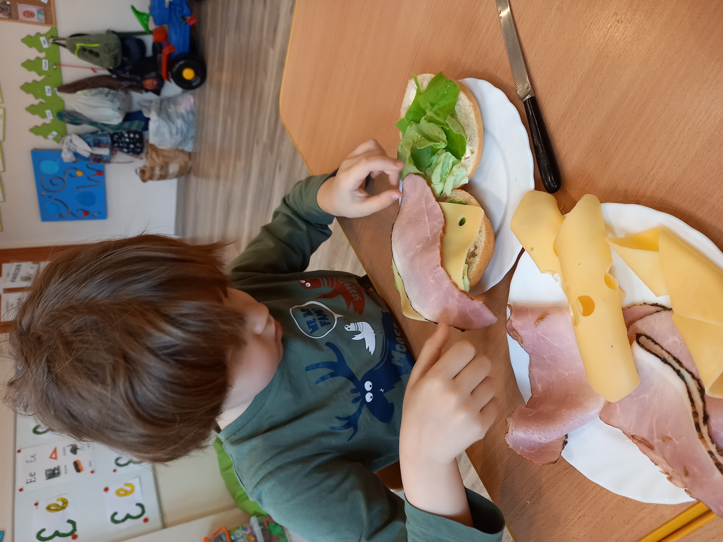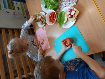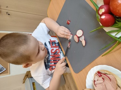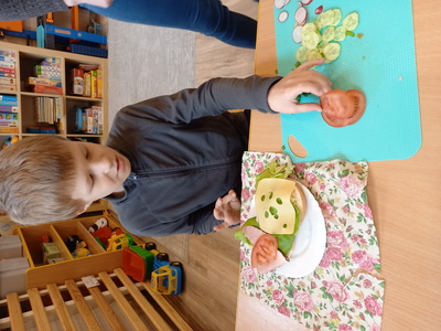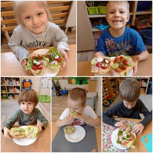 Dzieci z grupy S3 podjęły wielkie wyzwanie pod hasłem " robimy zdrowe kanapki". Zanim jednak przystąpiły do zadania dowiedziały się, jakie wartości odżywcze mają warzywa. Nazywały kolory i kształty warzyw, z których można zrobić smaczne i zdrowe kanapki. Dzieci samodzielnie smarowały pieczywo masłem, a następnie ułożyły na nim sałatę, wędlinę, ser i wcześniej pokrojone przez siebie warzywa. Wszyscy z wielkim apetytem zjedli przygotowane przez siebie kanapki.