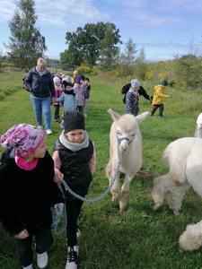 Dnia 22.09.2021 (środa) dzieci z gr.6A pojechały na Ranczo Rajec, gdzie spotkały się z przeuroczymi alpakami. Na początku spotkania pani właścicielka Rancza przedstawiła nam alpaki po imieniu, opowiedziała o ich życiu, zwyczajach a następnie mogliśmy nakarmić je przygotowanymi marchewkami, głaskać, przytulać się. Gdy alpaki się najadły wyprowadziliśmy je na spacer. Po powrocie ze spaceru zwierzęta sobie odpoczywały a my zjedliśmy pyszne kiełbaski z ogniska. Na zakończenie naszej wycieczki bawiliśmy się na placu zabaw zerkając na przeurocze alpaki. To była super wycieczka.