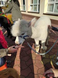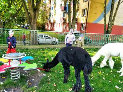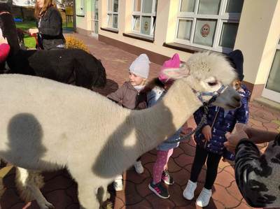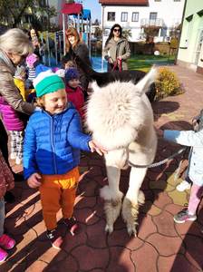 Dziś nasze przedszkole odwiedziły sympatyczne i milutkie Alpaki. Dzieci mogły nakarmić zwierzątka marchewką, pogłaskać mięciutkie futerko oraz poprowadzić samodzielnie Alpaki . Te delikatne zwierzątka o imieniu Pako i Fredzio wywołały na twarzach dzieci wspaniałe uśmiechy. Panowała miła i ciepła atmosfera, a dzieci nie mogły się napatrzeć na białą i czarną Alpakę. Tak nam wszystkim spodobało się przebywanie z Alpaką, że z trudem się z nimi rozstaliśmy. Mamy nadzieję, że uda nam się jeszcze kiedyś zobaczyć.