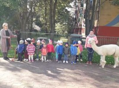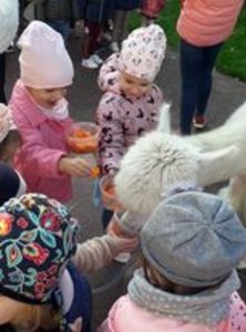 W dniu dzisiejszym gościliśmy na placu przedszkolnym "Alpaki". Dzieci z grup 3A,3B,3C przekonały się, że to przyjazne i łagodne zwierzęta. Przebywanie z nimi wywołało u dzieci uśmiech, wzbudziło poczucie empatii. Maluchy mogły głaskać, karmić i prowadzić zwierzęta. Nasze 3 latki były bardzo dzielne z zainteresowaniem obserwowały te miłe zwierzęta.