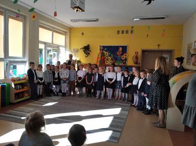 14 października to wyjątkowe święto, które obchodzi Grono Pedagogiczne. W tym dniu dzieci z grup 6A i 6B przygotowały występ dla wszystkich nauczycieli. Starszaki zaśpiewały piosenkę i wyrecytowały wierszyki, przypominając jak istotną rolę pełni nauczyciel w życiu każdego dziecka. Nie brakowało też życzeń i dziecięcych uścisków. Zatem jeszcze raz składamy nauczycielom serdeczne życzenia, dziękujemy za trud podejmowany na co dzień w pracy. Życzymy aby aktywna i twórcza postawa, znajdowała uznanie w oczach przedszkolaków i rodziców oraz była źródłem osobistej satysfakcji.