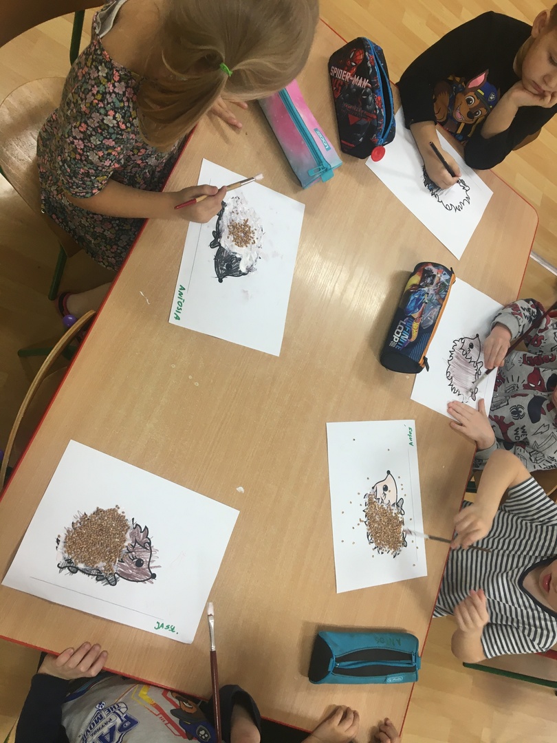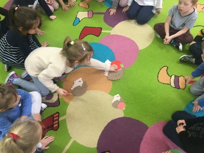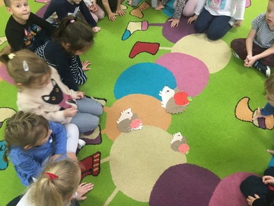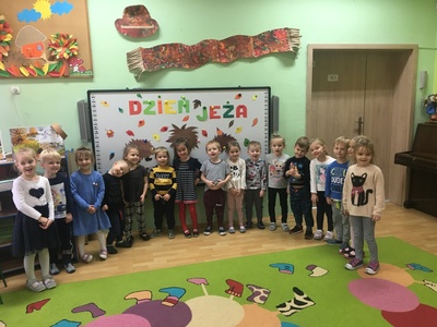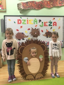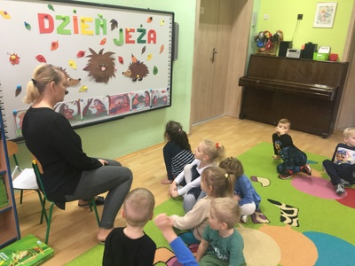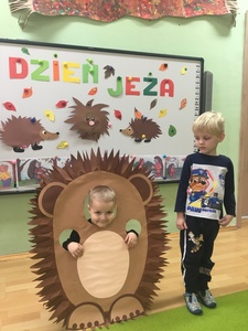 10 listopada to Międzynarodowy Dzień Jeża, święto malutkich, kłujących ssaków. Z tej okazji przedszkolaki z gr 4B włączyły się w obchody tego nietypowego święta. W dniu 16 listopada dzieci miały okazję poszerzyć oraz utrwalić swoją wiedzę dotyczącą życia jeży w ich naturalnym środowisku, poprzez wysłuchanie opowieści i wierszy o tych sympatycznych, zimowych śpiochach. Potem wesoło bawiły się i tańczyły przy muzyce i piosenkach o jeżach. Najwięcej radości sprawiła dzieciom jednak zabawa pt.: "Na dywanie siedzi jeż..." , w której wszyscy naśladowali ruchy swoich kolegów. Również dużym zainteresowaniem cieszy się zabawy matematyczne z jeżykami oraz fotobudka. Nie zabrakło zabaw twórczych. Dzieci pokolorowały postacie jeża i z pomocą pań dokleiły kolce z kaszy.