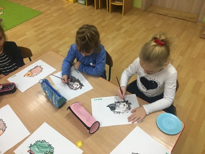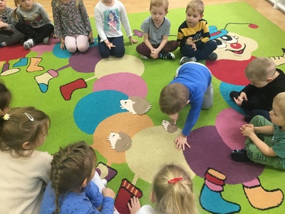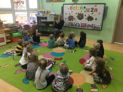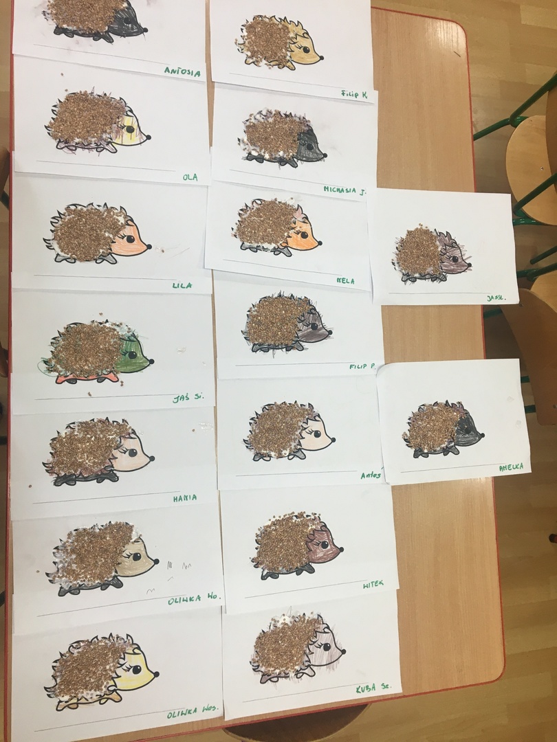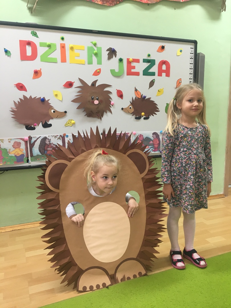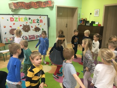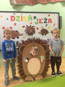 10 listopada to Międzynarodowy Dzień Jeża, święto malutkich, kłujących ssaków. Z tej okazji przedszkolaki z gr 4B włączyły się w obchody tego nietypowego święta. W dniu 16 listopada dzieci miały okazję poszerzyć oraz utrwalić swoją wiedzę dotyczącą życia jeży w ich naturalnym środowisku, poprzez wysłuchanie opowieści i wierszy o tych sympatycznych, zimowych śpiochach. Potem wesoło bawiły się i tańczyły przy muzyce i piosenkach o jeżach. Najwięcej radości sprawiła dzieciom jednak zabawa pt.: "Na dywanie siedzi jeż..." , w której wszyscy naśladowali ruchy swoich kolegów. Również dużym zainteresowaniem cieszy się zabawy matematyczne z jeżykami oraz fotobudka. Nie zabrakło zabaw twórczych. Dzieci pokolorowały postacie jeża i z pomocą pań dokleiły kolce z kaszy.