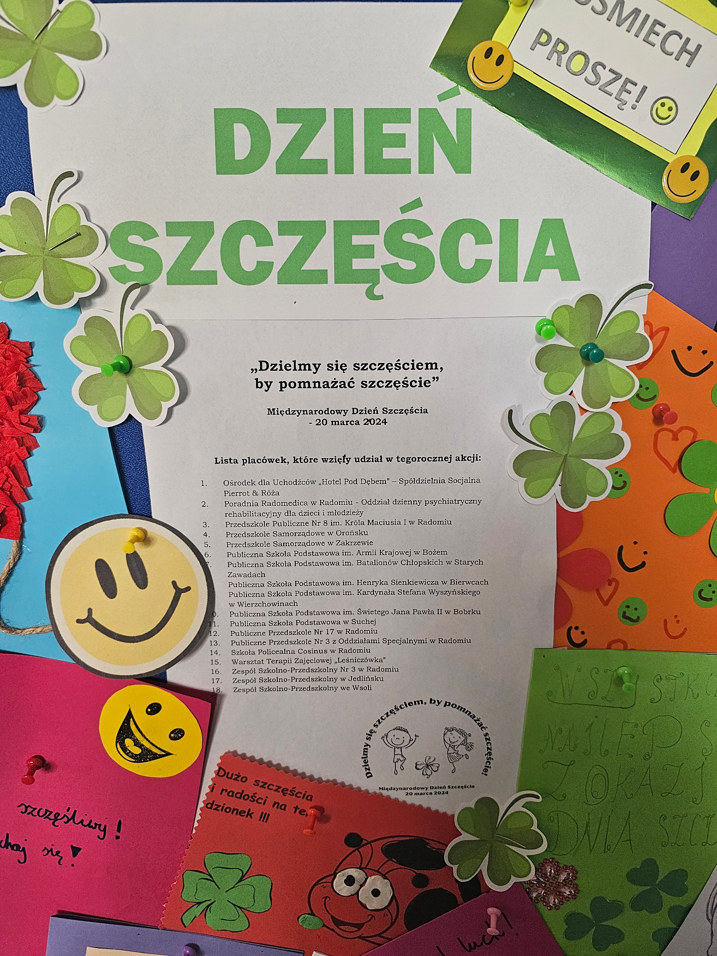 20.03.2024r. obchodziliśmy Międzynarodowy Dzień Szczęścia. Nasze przedszkole po raz drugi wzięło udział w akcji ,,Dzielmy się szczęściem, by pomnażać szczęście”. Głównym celem akcji było propagowanie pozytywnych emocji i wzajemnej życzliwości. Z tej okazji do naszego przedszkola dotarły kartki na których pojawiły się symbole szczęścia m.in. czterolistna koniczynka i uśmiechnięta buzia.