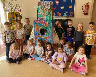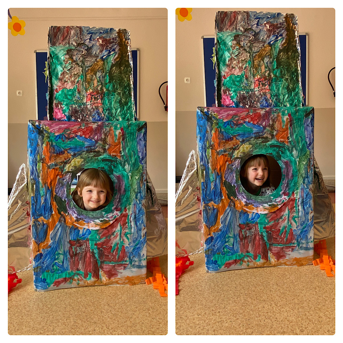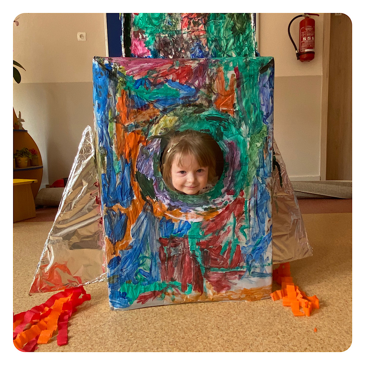 Kosmiczna podróż grupy 4A 17.04. dzieci z grupy 4a wspólnie wykonały ogromną, kolorową rakietę kosmiczną, którą wybrały się w kosmiczną podróż międzygalaktyczną.