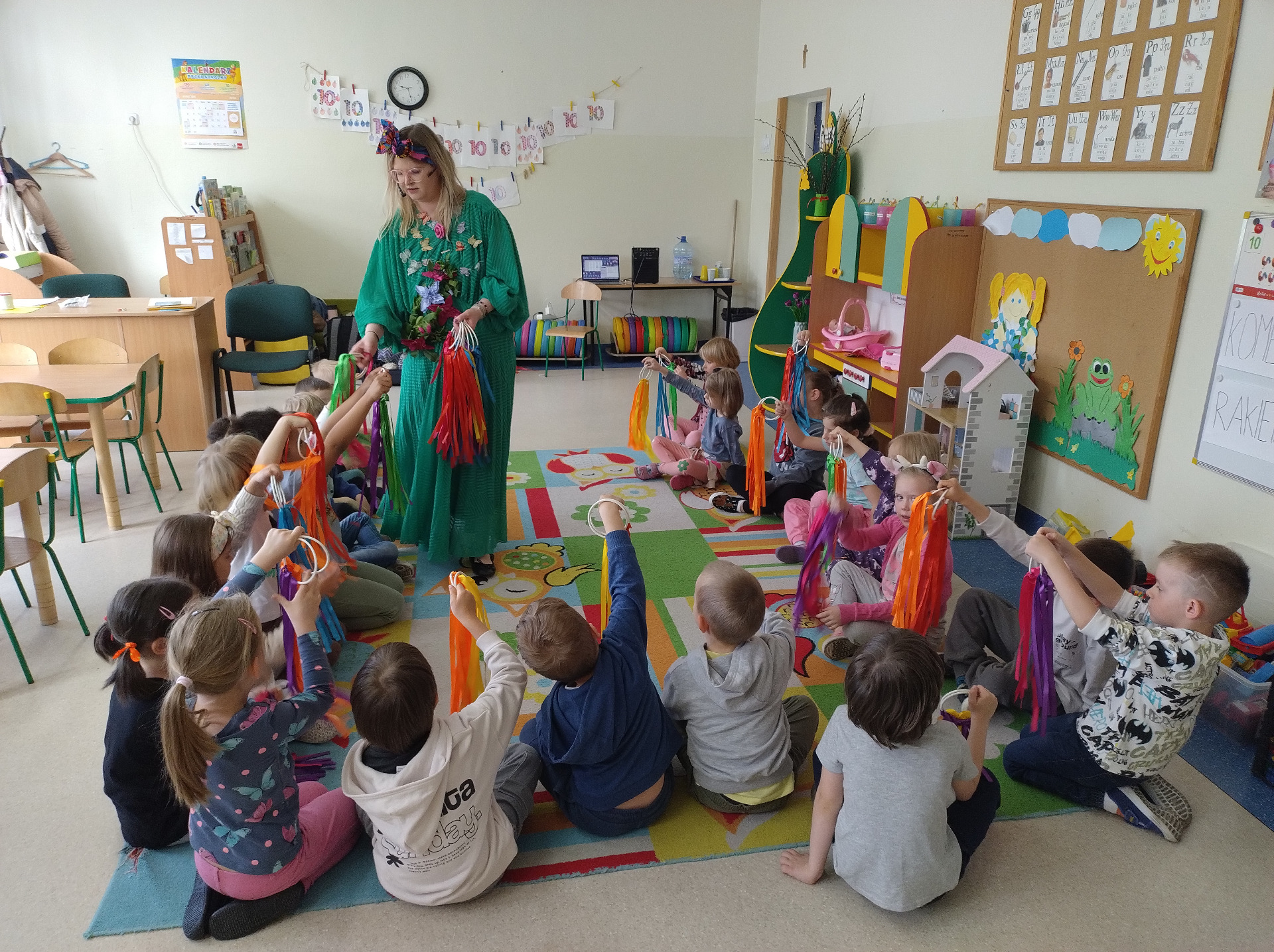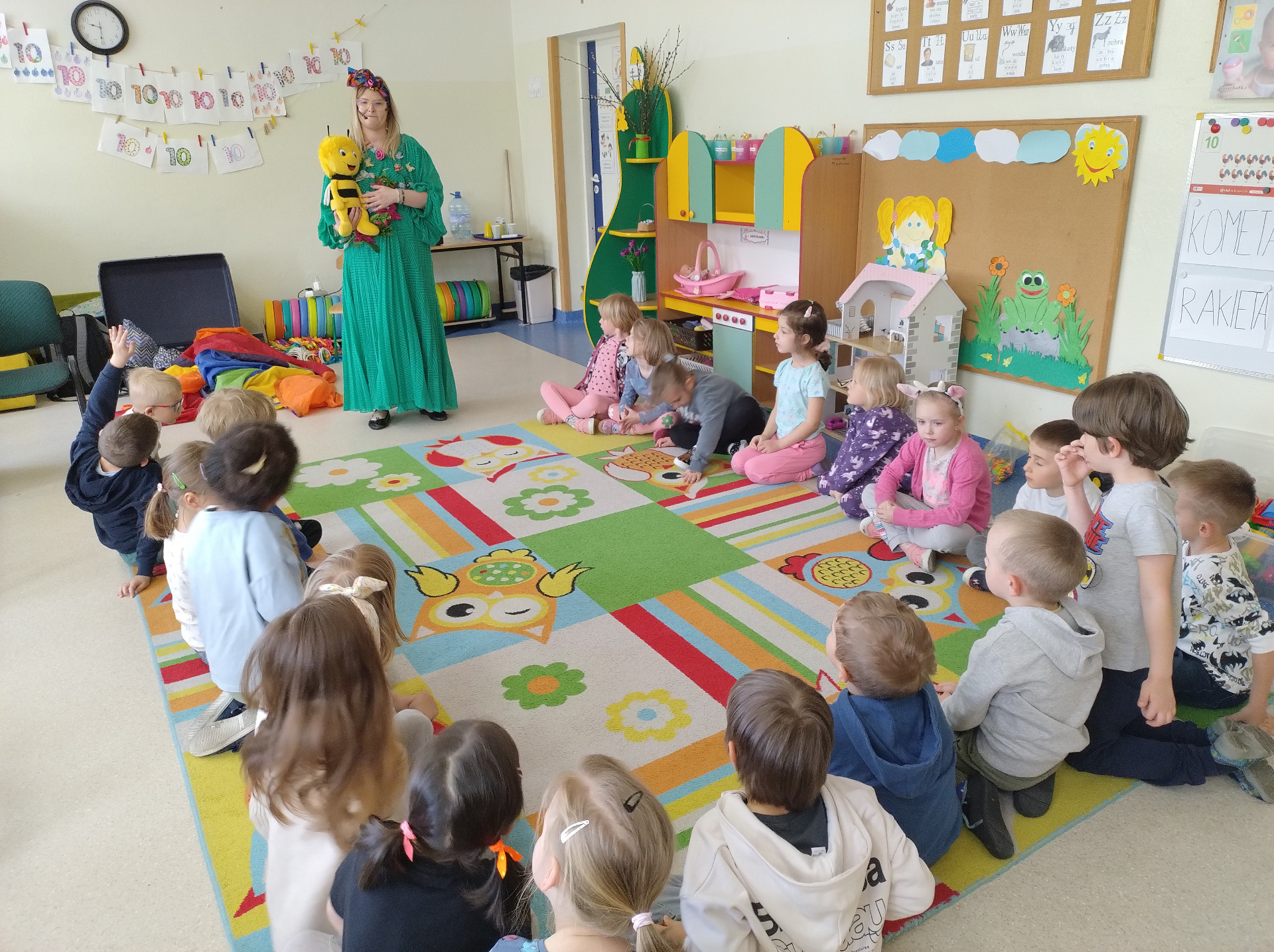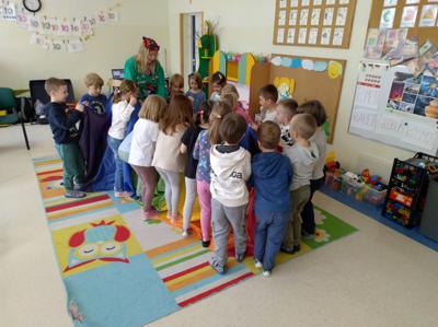 Ence-pence to wynik fascynacji światem wyobraźni, miłości do muzyki, tworzenia i działania oraz chęci pobudzania dziecięcej kreatywności, która odpowiednio stymulowana, potrafi zabrać w niezapomnianą podróż. 19.04.2024 r. dzieci z grup 5A i 5B aktywnie uczestniczyły w teatrzyku inspirowanym bajką"Pszczółka Maja". Dzieci w wielkim skupieniu wykonywały prośby Pani Kingi były bardzo zainteresowane i aktywnie grały na instrumentach, zamieniały się w kolorowe piękne motyle, udawały wiatr. Na pewno Pszczółka Maja pozostanie w pamięci dzieci na długie lata.