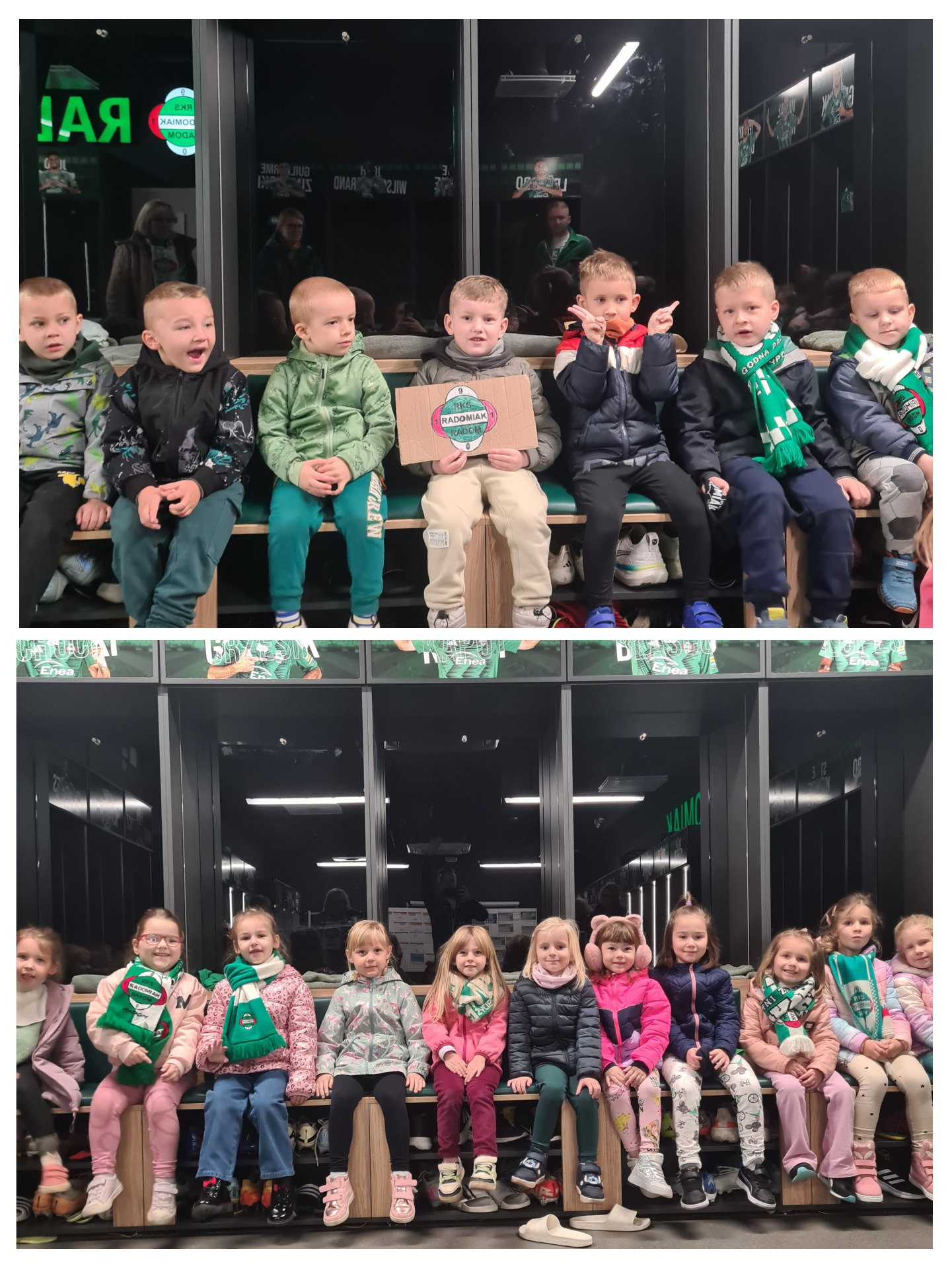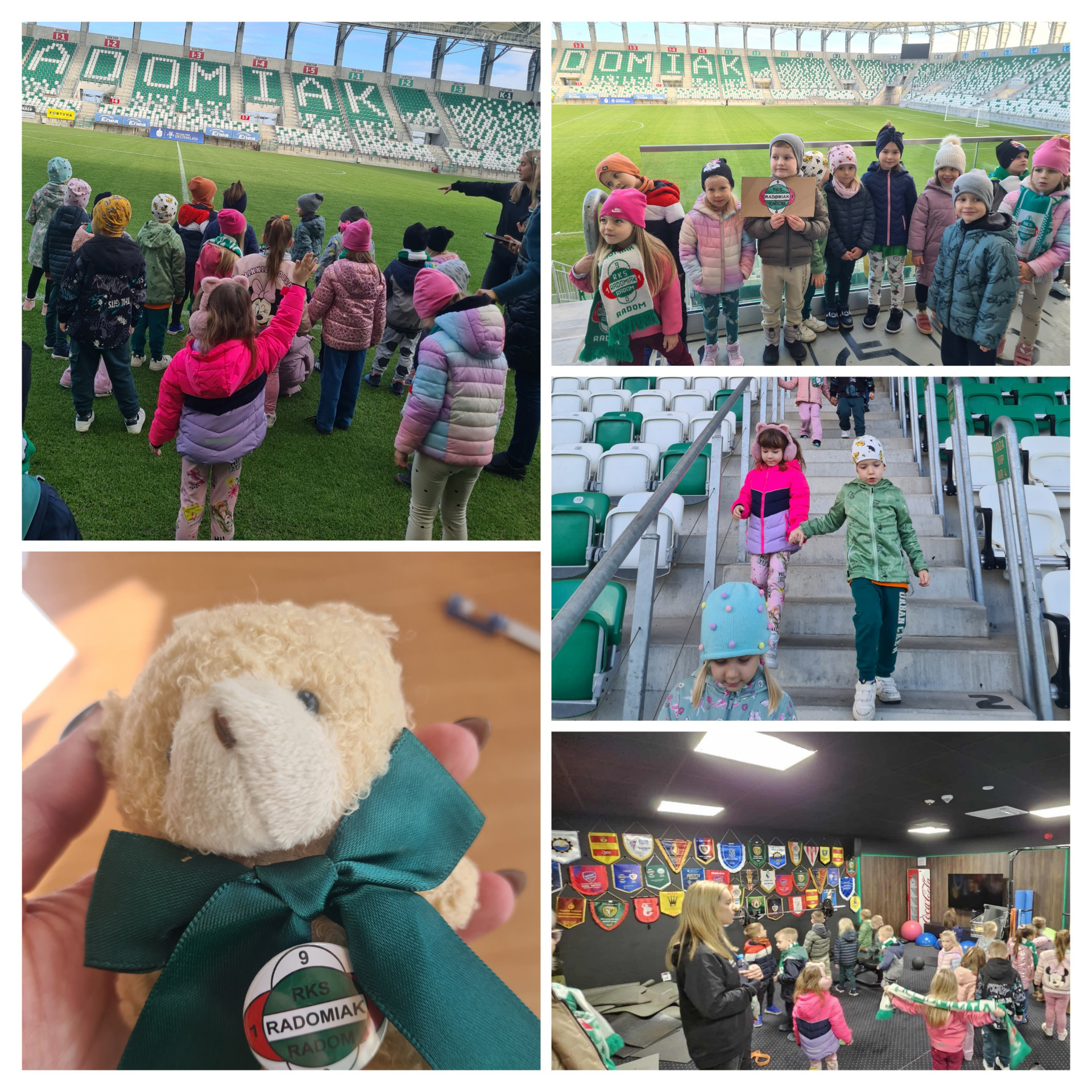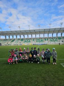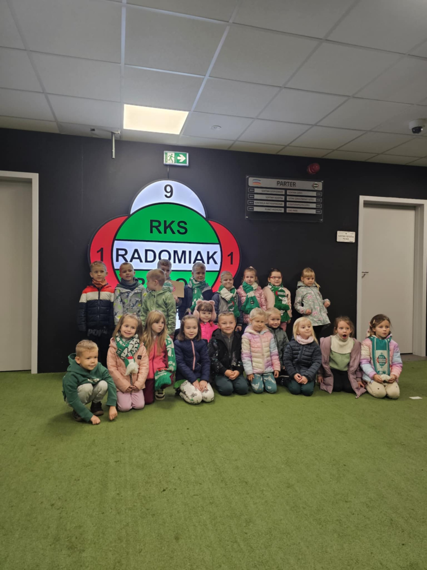 Dnia 06.10.2025 Przedszkolaki z grupy 5B wybrali się na wycieczkę do Radomskiego Centrum Sportu. Podczas wizyty mieliśmy okazję poznać drogę, jaką na co dzień pokonują piłkarze Radomiaka Radom, od wejścia do szatni aż po wyjście na murawę stadionu. Zwiedziliśmy szatnie zawodników, siłownię, stadion, ławkę rezerwowych oraz lożę VIP. Przewodniczka opowiadała wiele ciekawostek o klubie, jego historii i przygotowaniach do meczów. Na zakończenie zrobiliśmy sobie pamiątkowe zdjęcia na trybunach i przy murawie. Wycieczka była bardzo interesująca i dostarczyła nam wielu miłych wrażeń. Wszyscy wróciliśmy zadowoleni i pełni sportowych emocji.