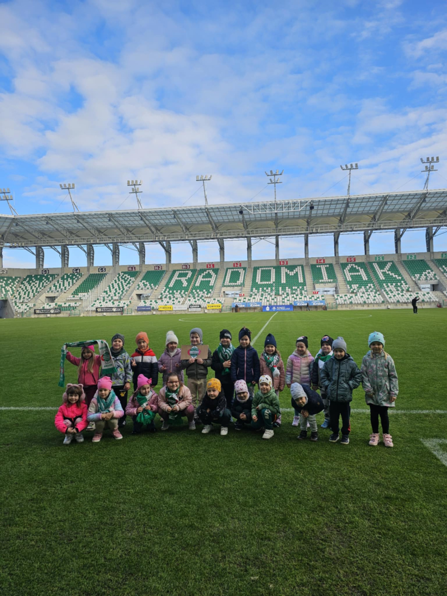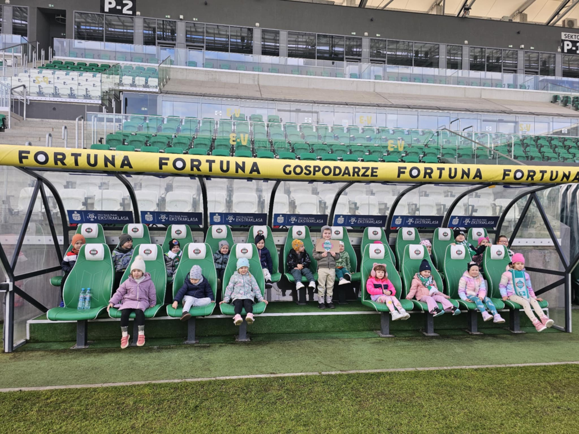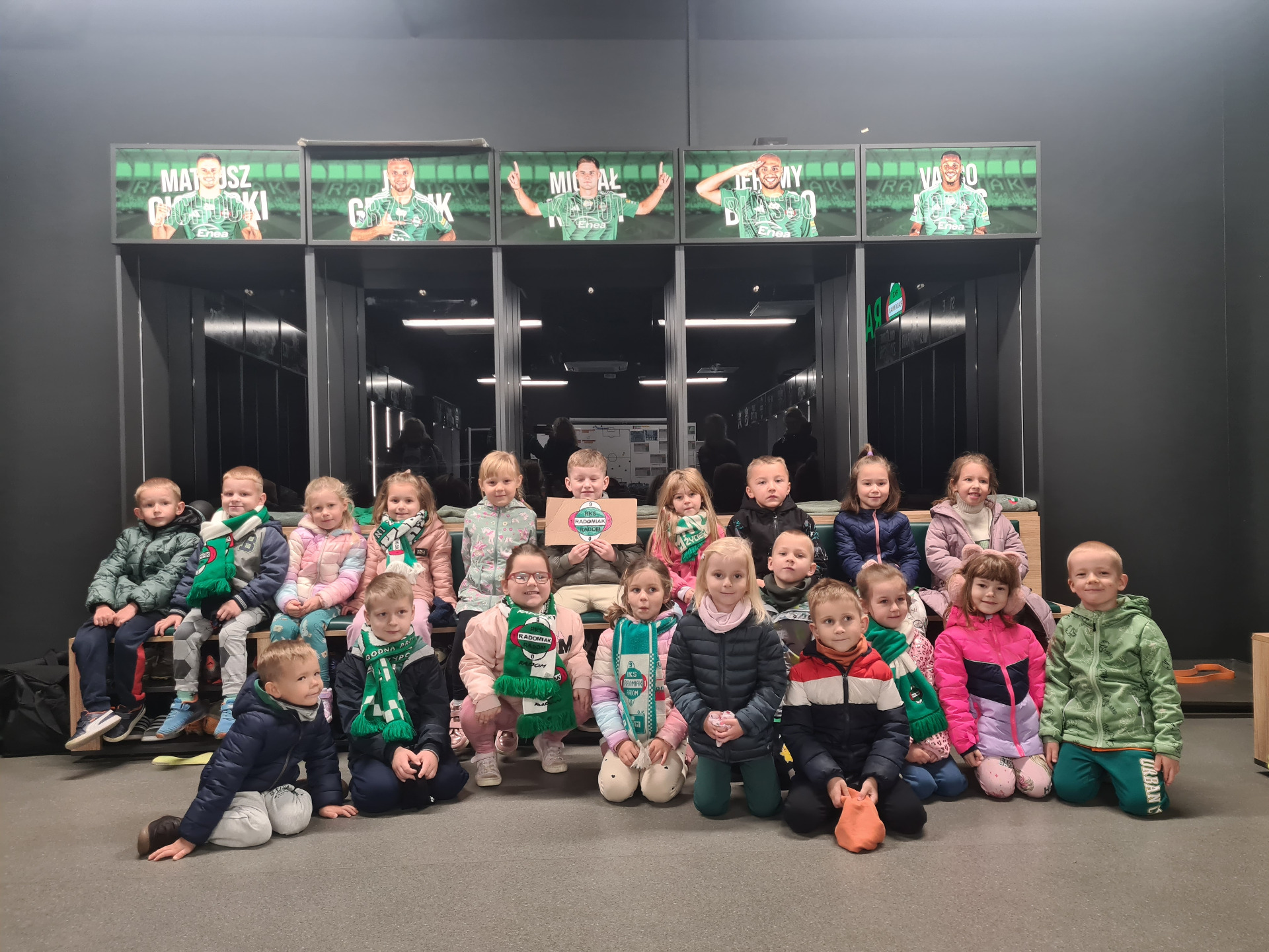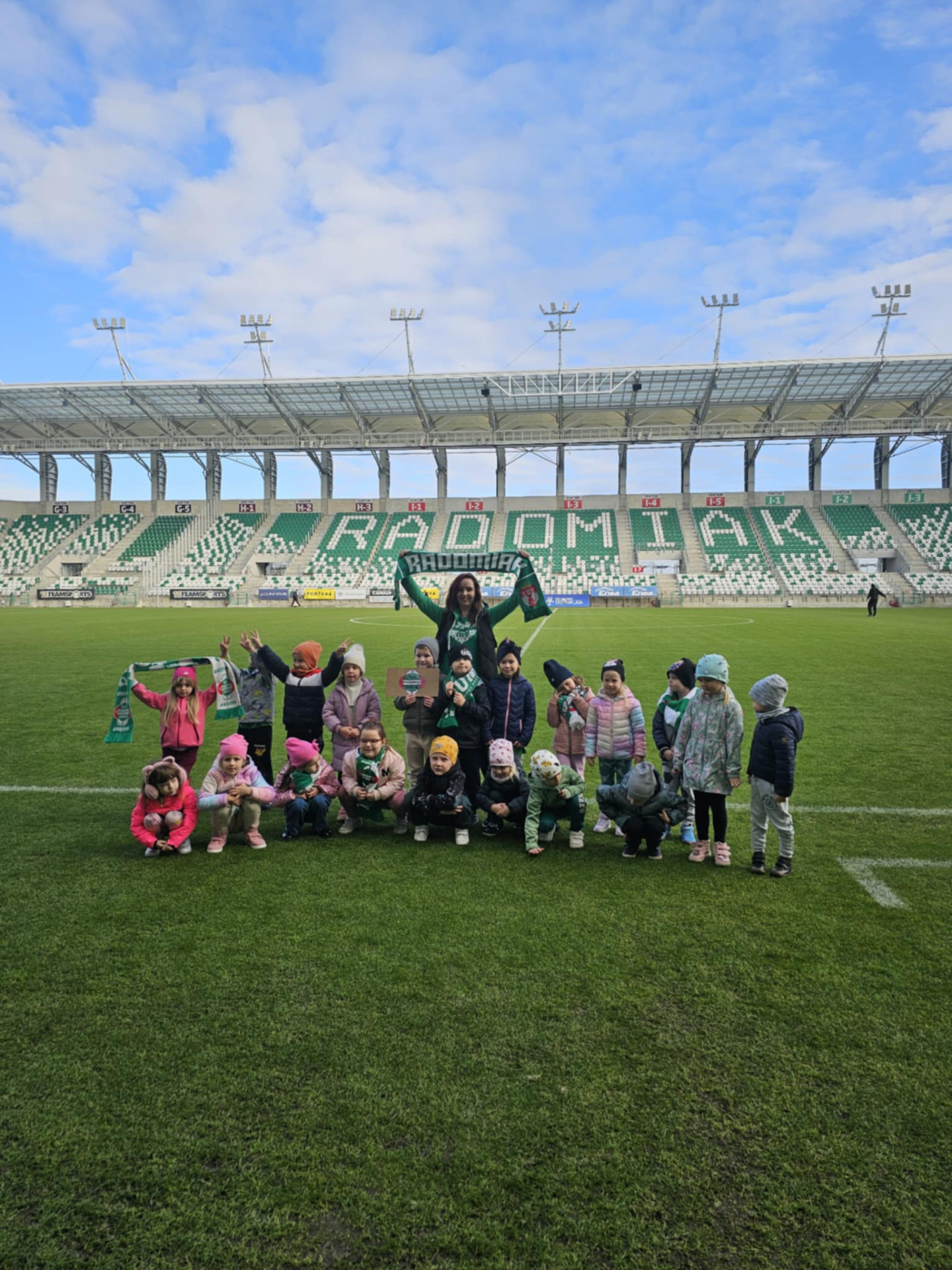 Dnia 06.10.2025 Przedszkolaki z grupy 5B wybrali się na wycieczkę do Radomskiego Centrum Sportu. Podczas wizyty mieliśmy okazję poznać drogę, jaką na co dzień pokonują piłkarze Radomiaka Radom, od wejścia do szatni aż po wyjście na murawę stadionu. Zwiedziliśmy szatnie zawodników, siłownię, stadion, ławkę rezerwowych oraz lożę VIP. Przewodniczka opowiadała wiele ciekawostek o klubie, jego historii i przygotowaniach do meczów. Na zakończenie zrobiliśmy sobie pamiątkowe zdjęcia na trybunach i przy murawie. Wycieczka była bardzo interesująca i dostarczyła nam wielu miłych wrażeń. Wszyscy wróciliśmy zadowoleni i pełni sportowych emocji.