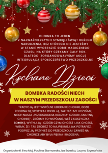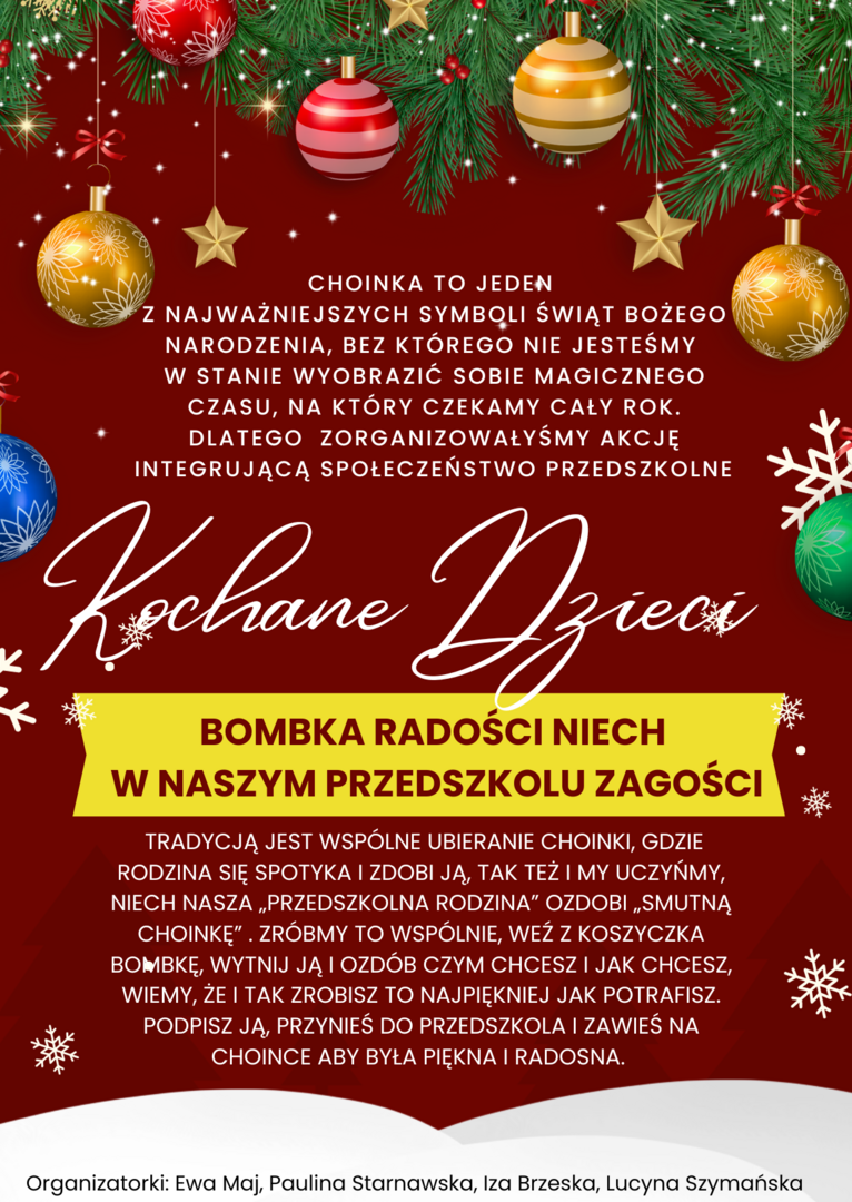 BOMBKA RADOŚĆI Galeria zdjęć Powiązane wiadomości Zajęcia adaptacyjne Komunikat w sprawie zawieszenie zajęć dydaktyczno-wychowawczych... Potwierdzenie woli kontynuacji uczęszczania do... BOMBKA RADOŚĆI Rozstrzygnięcie konkursu recytatorskiego pt. "Dbamy... Zajęcia adaptacyjne dla dzieci 3 letnic Drukuj Udostępnij Data dodania: 12.12.2023 Wyświetlono: 268 Ogłoszenia