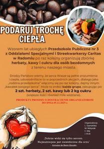 Nasze przedszkole i Streetworkerzy Caritas w Radomiu również w tym roku szkolnym zapraszają do włączenia się w akcję charytatywną pt. PODARUJ TROCHĘ CIEPŁA.