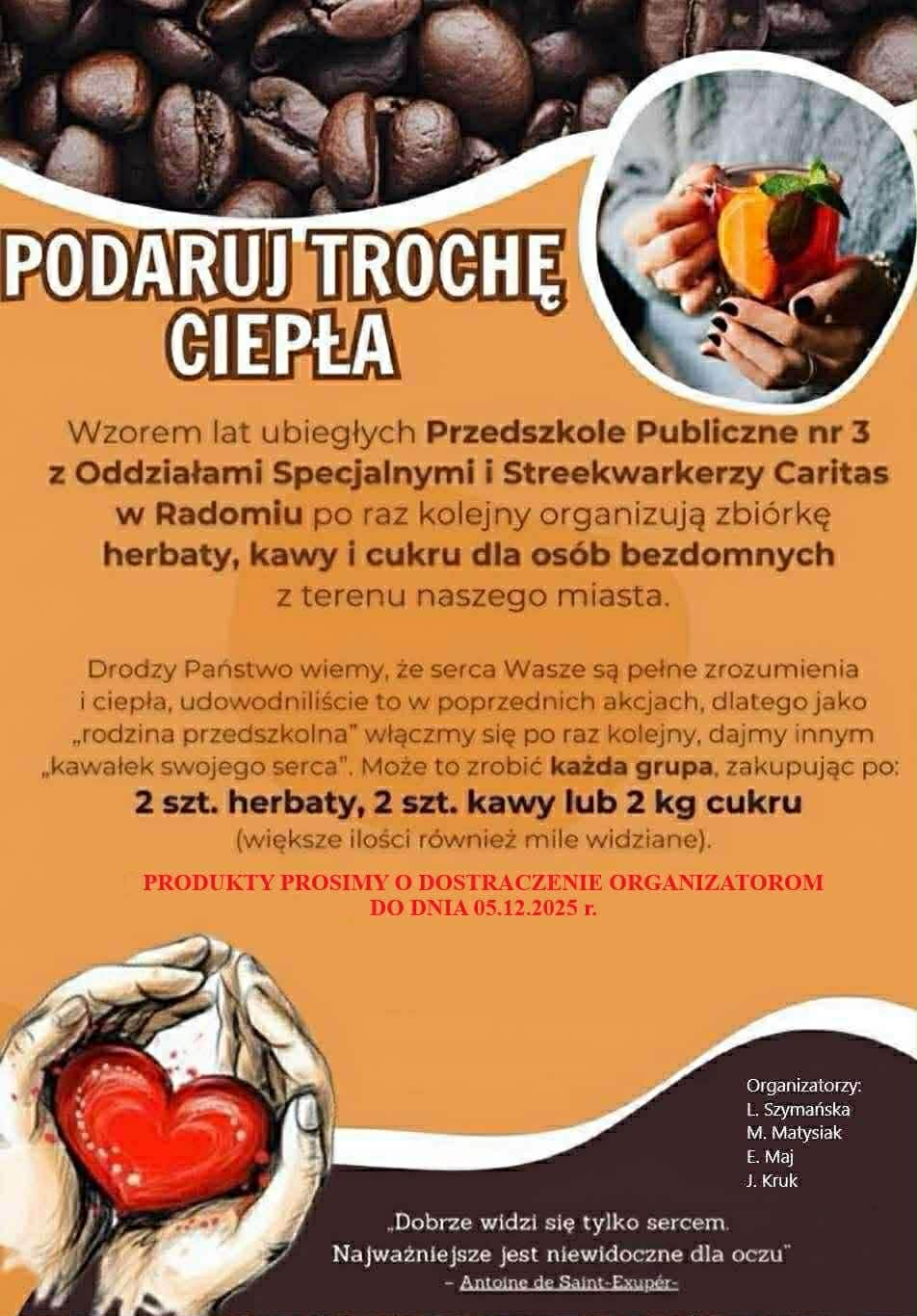Celem akcji jest zbiórka herbaty, kawy, cukru dla osób bezdomnych w Radomiu.